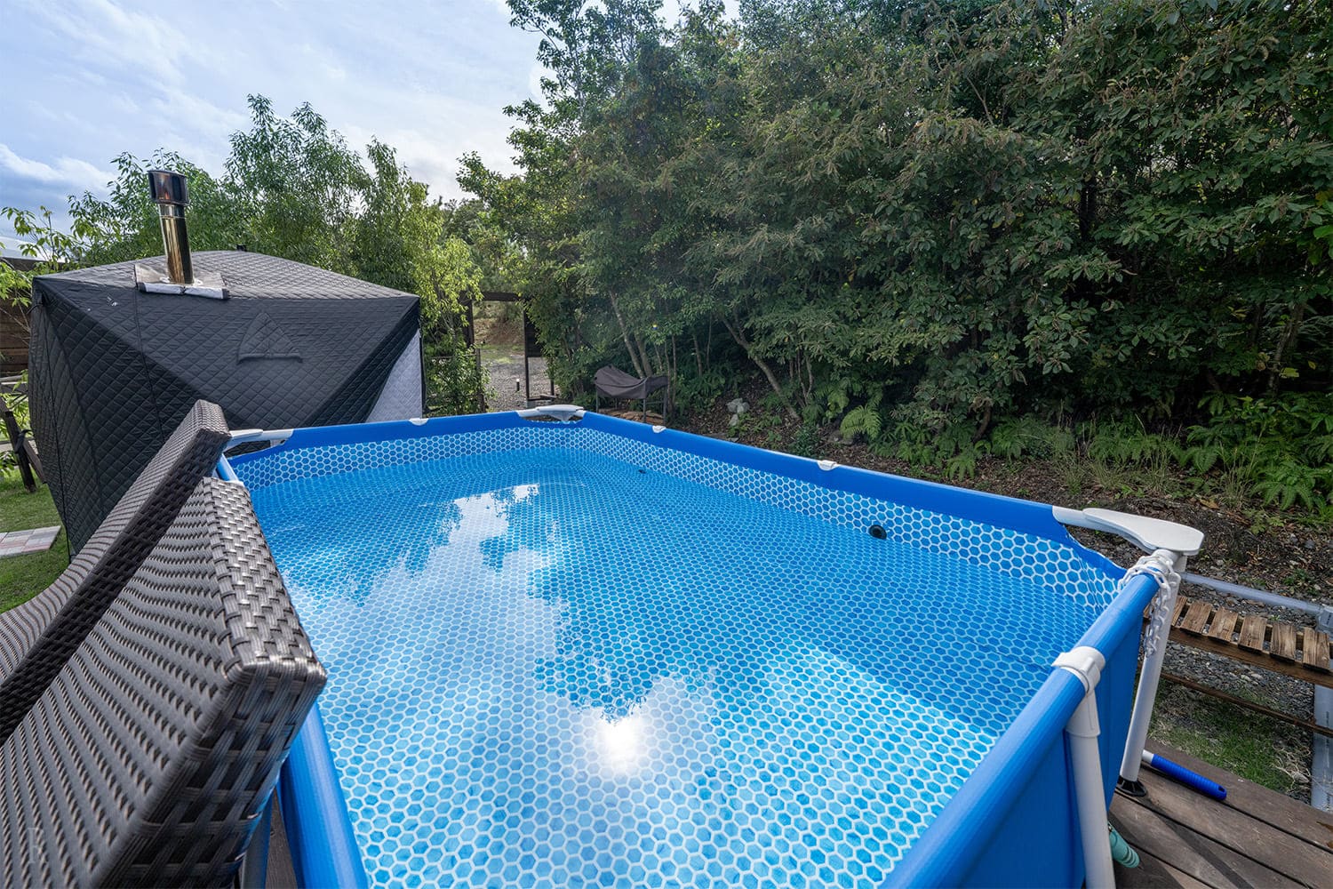 専用のテントサウナ、ミニプールを設置しております。サウナ用の作務衣はご用意ございます。ミニプールご使用の際には水着をお持ちください。