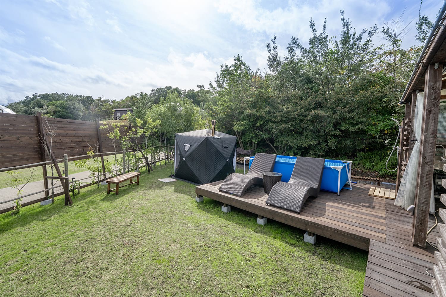 また、専用のテントサウナ、ミニプールを設置しております。サウナ用の作務衣はご用意ございます。ミニプールご使用の際には水着をお持ちください。
